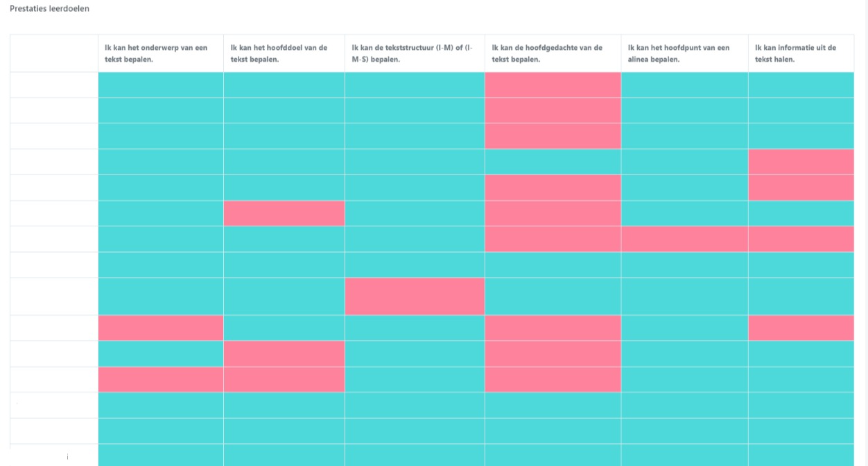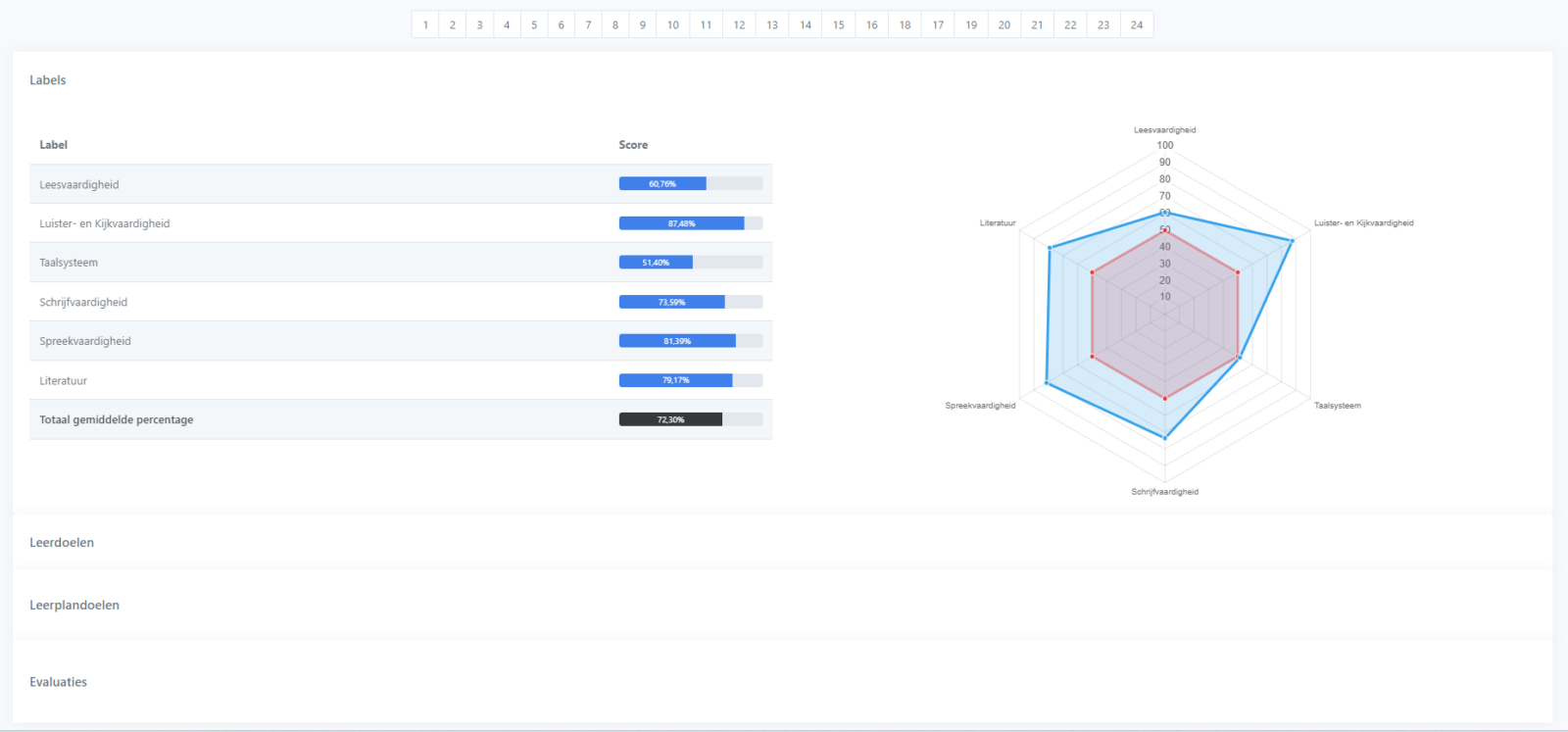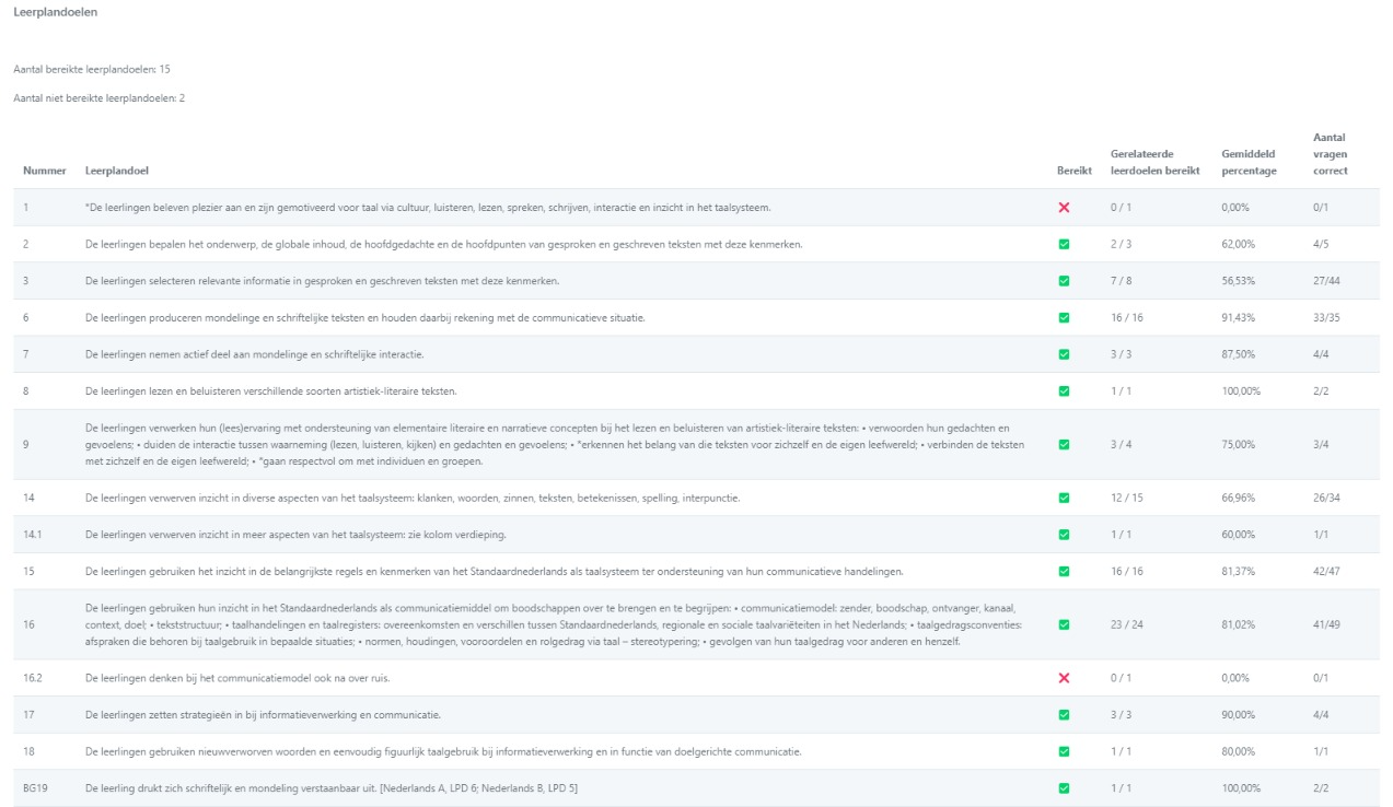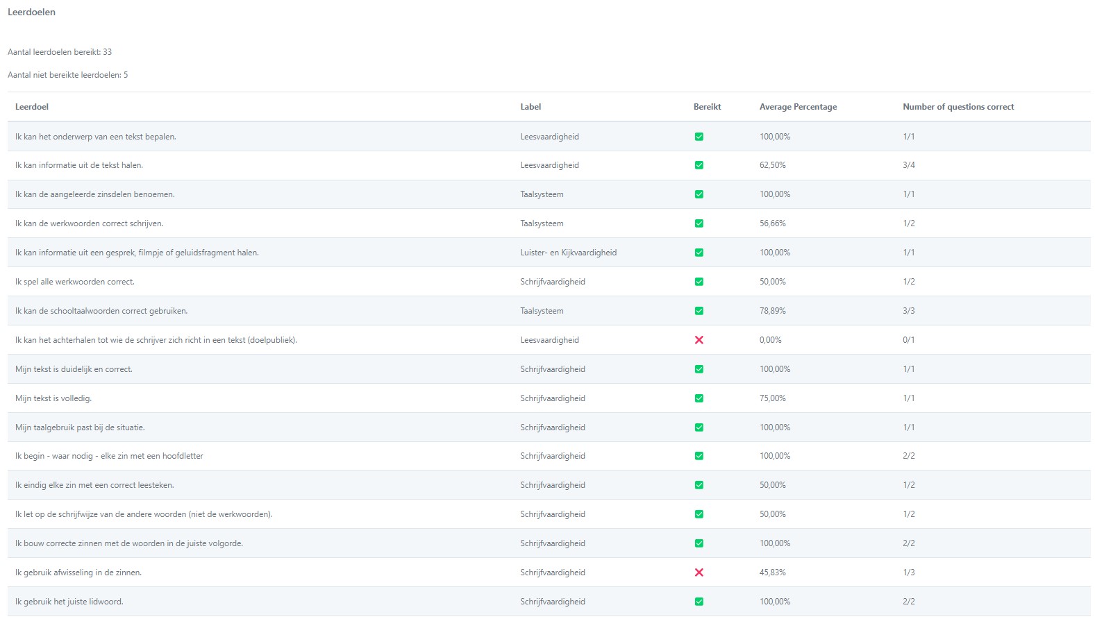 Raadpleeg de gedetailleerde en heldere statistieken over de leerprestaties van jouw leerlingen. Van minimum- en leerplandoelen tot je eigen leerdoelen.
